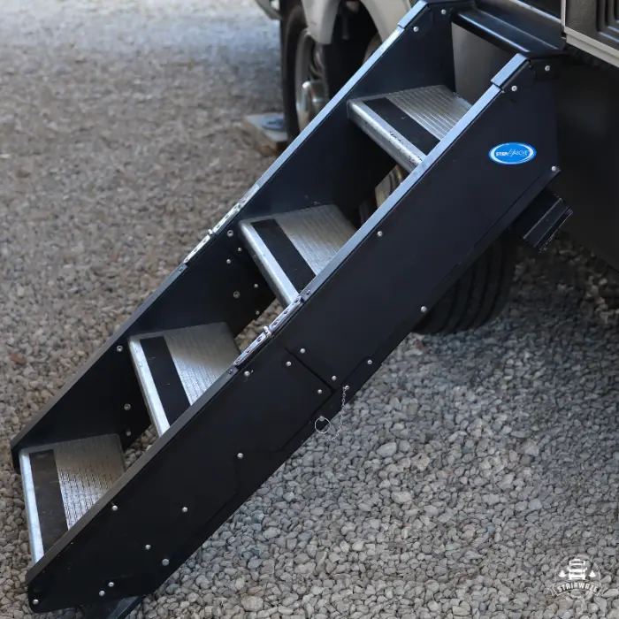Our heavy-duty hinge and mechanically attached cradle system ensure smooth operation and rock-solid stability. Constructed from 316 Marine-grade stainless steel and powder-coated galvanized steel, the Stairwaze™ kit is built to withstand the rigors of the road.